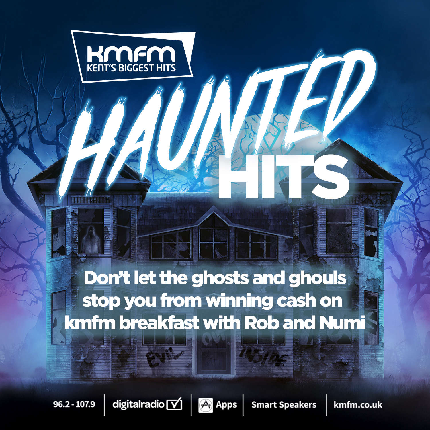 Listen to kmfm Breakfast with Rob & Numi (06:30 - 10:00) and when they play a Haunted Hit that's your cue to text and you could win a cash prize of £100!